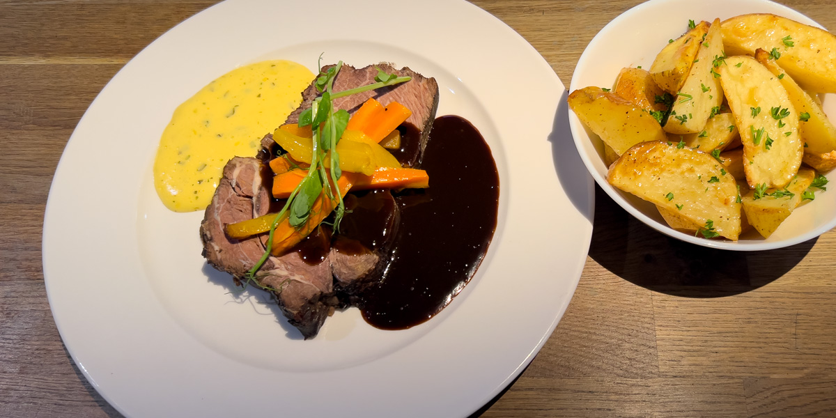 Långbakad högrev | Med rödvinssås, bearnaise, rostade rotfrukter och friterad potatis |