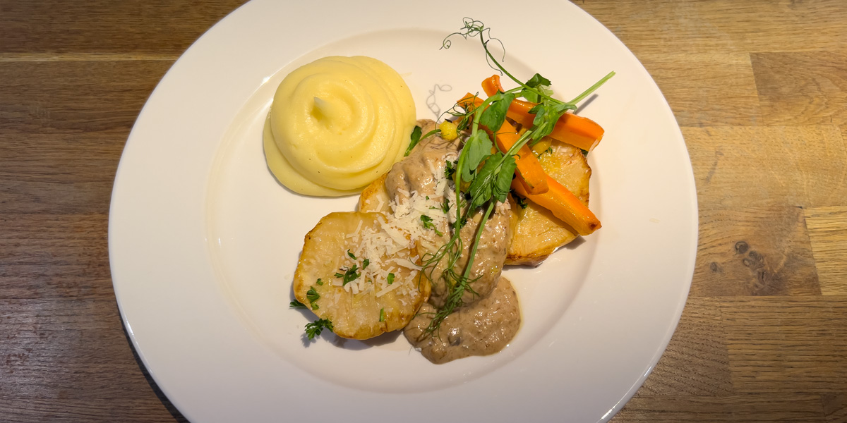 Kryddstekt rotselleri | Med svampsås, parmesan och potatispuré |