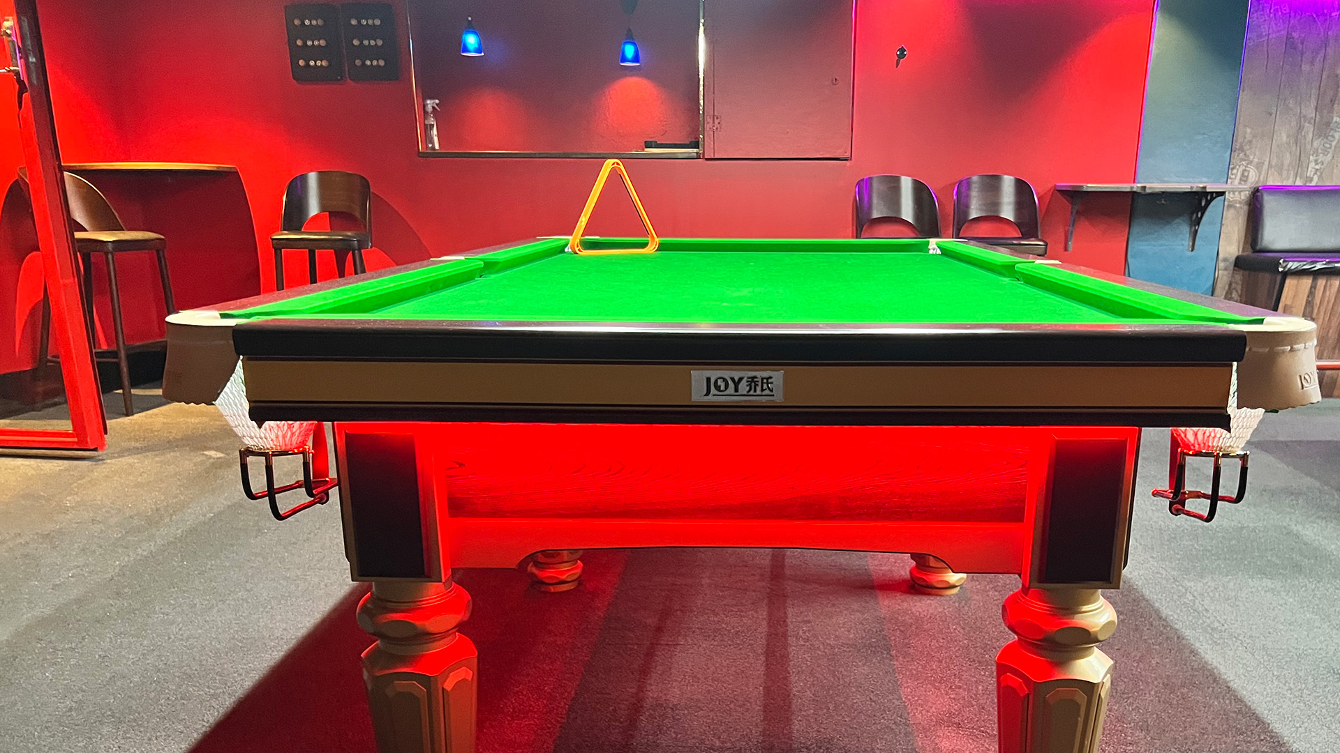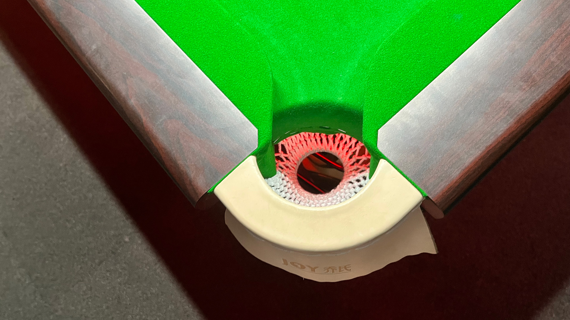 Heball bordet är stort som vanligt biljardbord men hålen mycket mindre- En helt annan sorts duk. Man måste tänka helt annorlunda. Man spelar med vanlig biljardbollar.